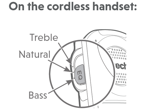 The equalizer on the cordless handset and telephone base enable you to change the quality of the audio for both handset earpiece and speakerphone to best suit your hearing. The default setting is Natural.